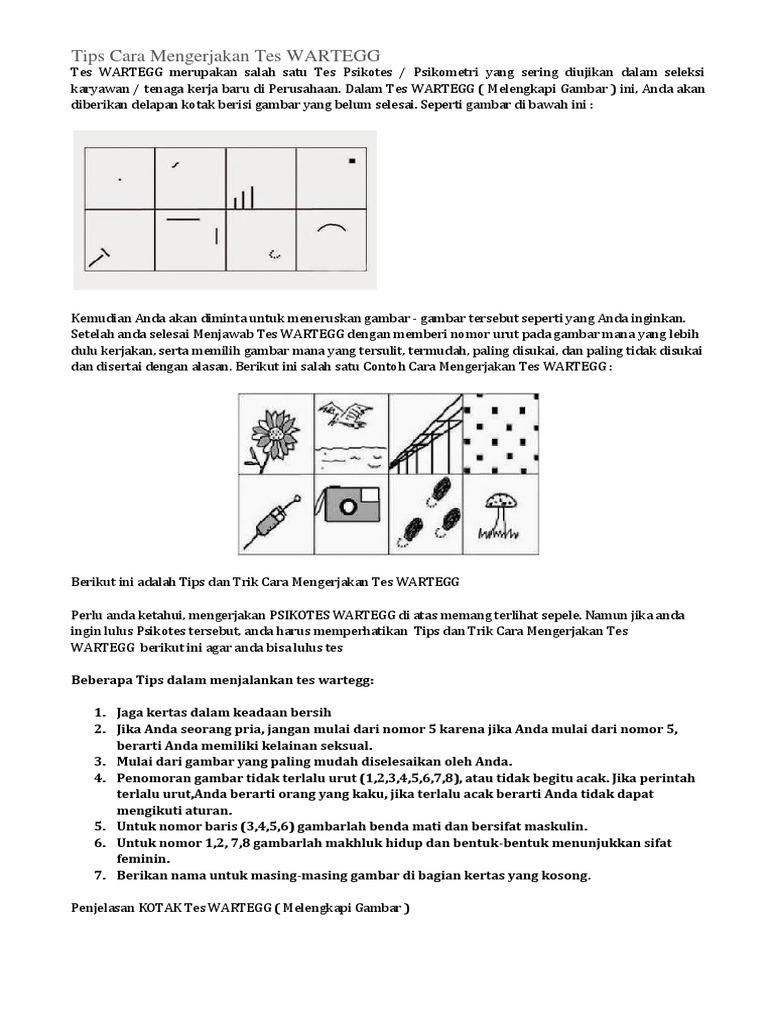 Menjalani tes psikotes kerja jadi salah satu tahapan dari proses rekrutmen di suatu perusahaan. Pada lembar kerja tes psikotes berisi 8 kotak yang nantinya kamu akan diminta untuk menggambarnya, kemudian menuliskan urutan gambar yang dibuat, nomor gambar yang paling. Tes wartegg (contoh soal psikotes wartegg). Tes ini dapat berbentuk tertulis, proyektif Tips mengerjakan soal psikotes kerja.